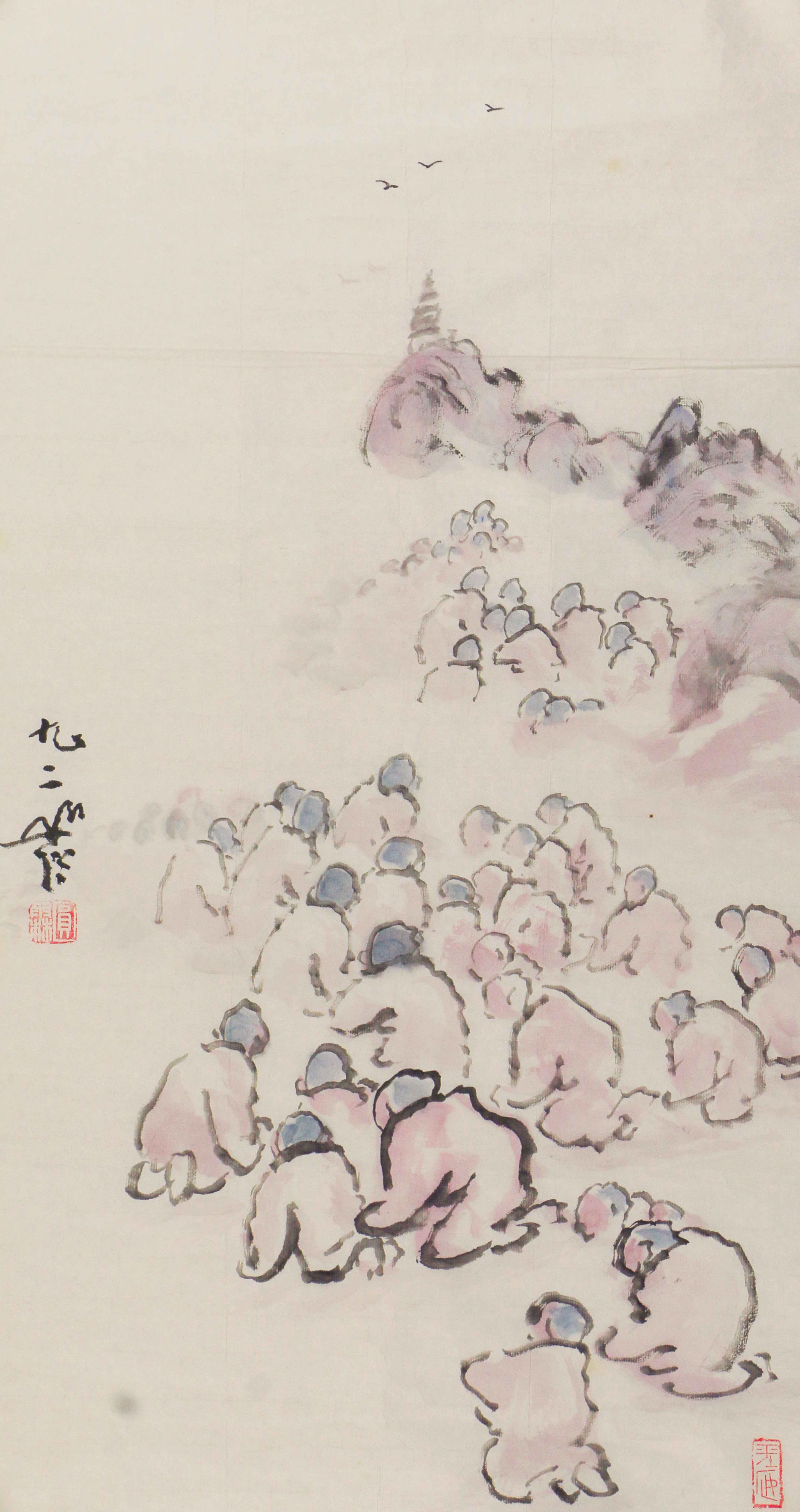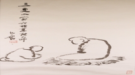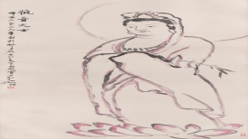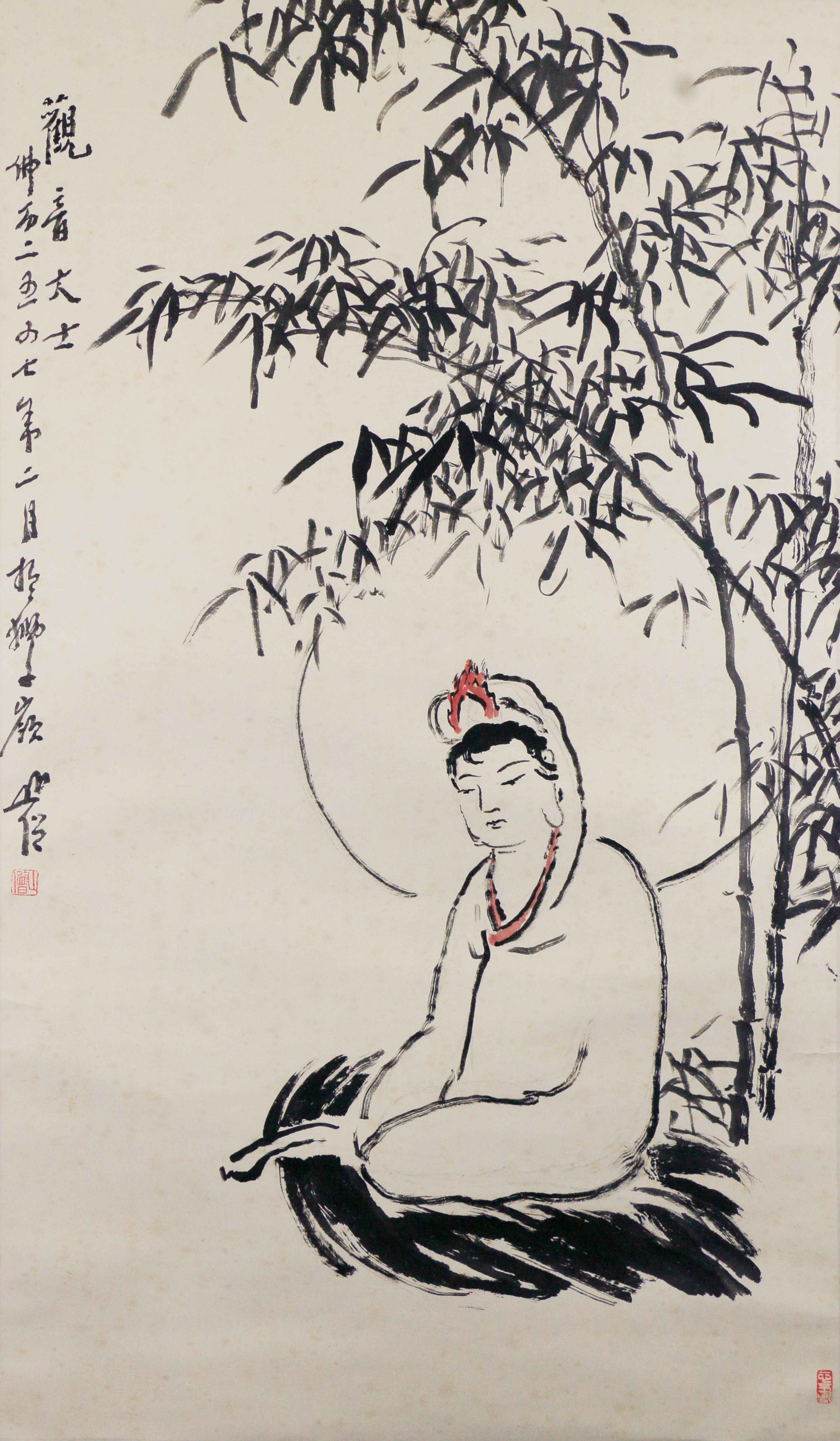 这是日本绘画大师狩野芳崖先生(1812--1888年)的一副精品.圆霖师父在解放前的青年时代就非常欣赏这副画.苦苦寻觅了几十年,后来终于在去年元旦前其弟子正林的帮助下,在日本博物馆找到了这副画的真迹,然后正林师兄想方设法搞到<<悲母观音>>的印刷品和明信片给师傅寄来。 师父收到其弟子从日本寄来的这副画,如获珍宝,一直小心翼翼的珍藏着.并且临摹了几张都被人请走.后来,他老人家还在此画的