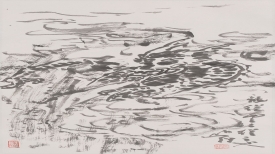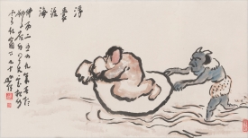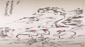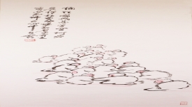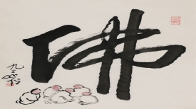 有一天,师父整理书柜,从底层翻出一张被老鼠咬坏了的残缺手稿,且已霉变不堪.他老告诉我:”这是我甲子年间抄写书上的一段关于马克思对佛教的评介.你看,坏成这样可管复制?”我接过师父交给我的手稿回答:”管!我一定想法修复!” 2007年元旦这一天,当我将复制如新的手稿交到师傅的手中,他老的脸上露出了欣喜的微笑.他手指着那张宣纸的空白处风趣地说道:”好!我在这半边给你写个大大的佛字!想当年周恩来总理一